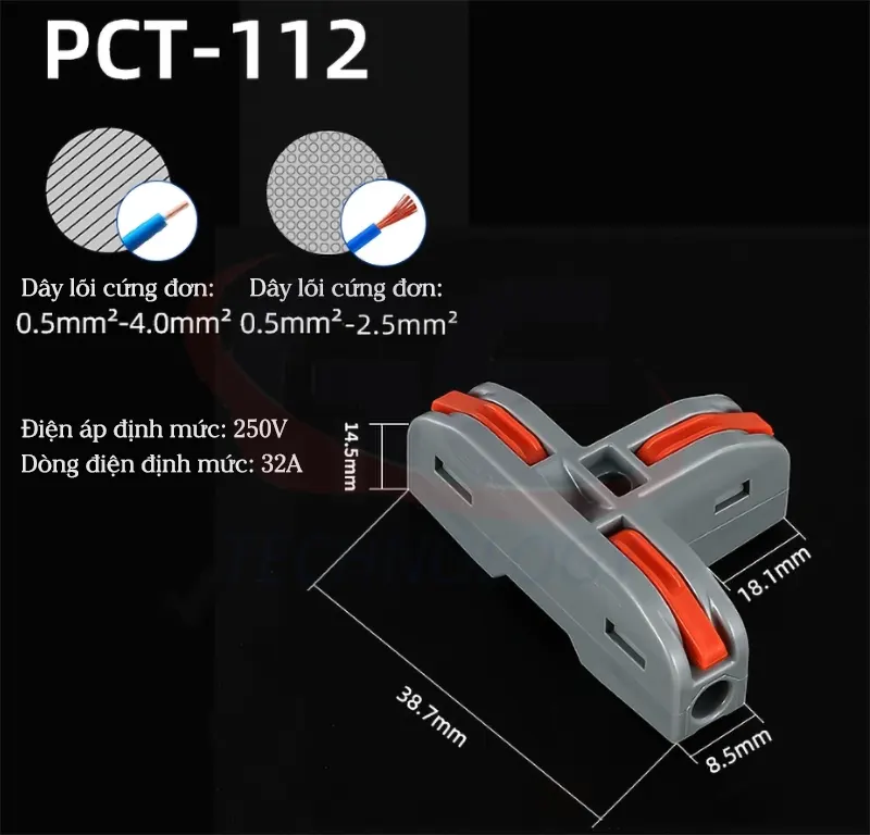 Cút nối nhanh dây điện chữ T PCT-112 dùng kết nối dây điện có đường kính từ 0.5-4 mm2 với Dây lõi cứng đơn, 0.5-2.5 mm2 với Dây mềm nhiều lõi, đòng tải tối đa 32A và điện áp định mức AC250V.
