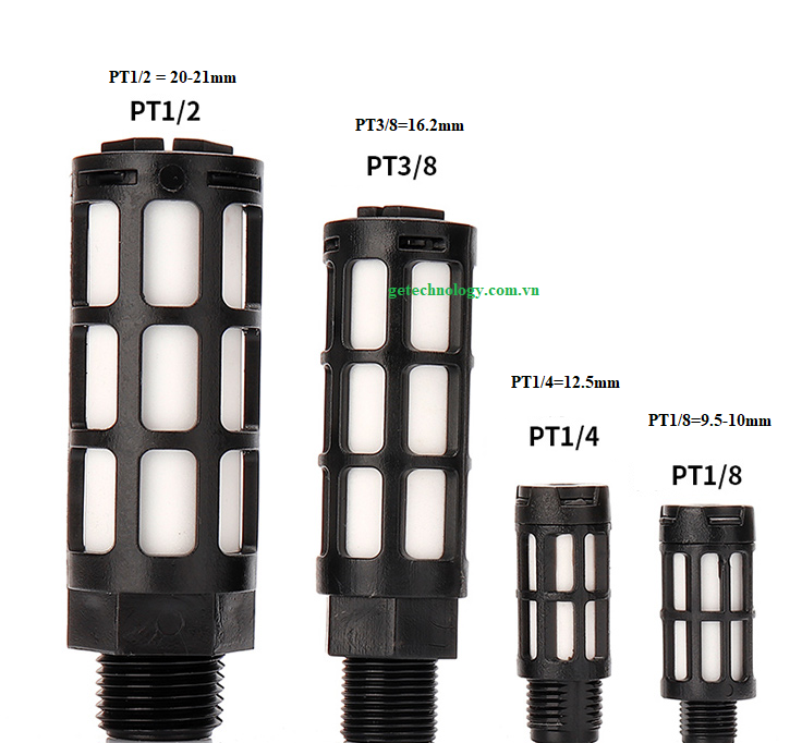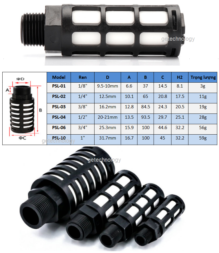 Giảm âm nhựa PSL-01 PSL-02 PSL-03 PSL-04 Ren 1/2 1/4 1/8 3/8 Tiêu âm nhựa PSL-01 PSL-02 PSL-03 PSL-04 Ren 1/2 1/4 1/8 3/8