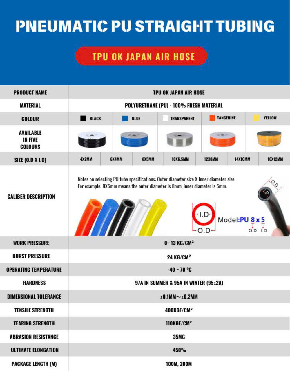 Ống dây khí nén PU màu trắng và xanh dương, đen, đỏ, vàng có sẵn phi 4,6,8,10,12,14,16mm - hãng OK liên doanh Việt Nhật