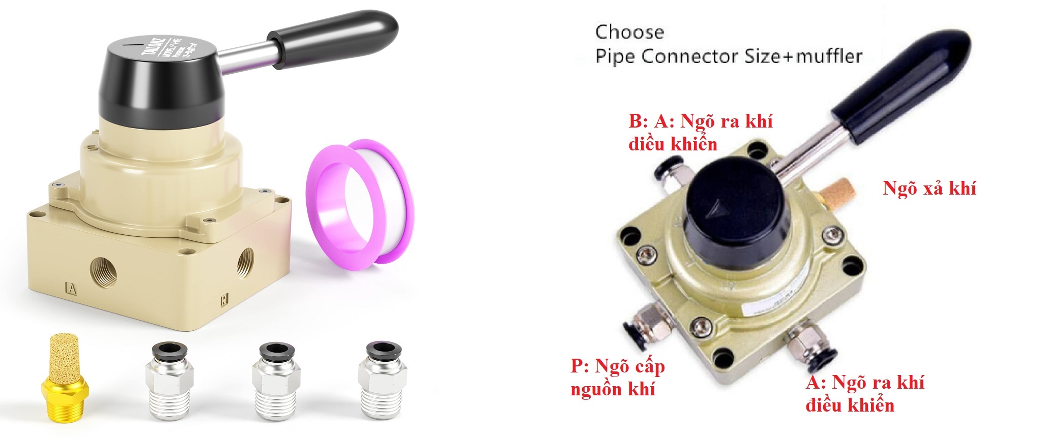 - Dạng tác động : Thay đổi chiều hướng lưu thông khí nén theo các gat tay
